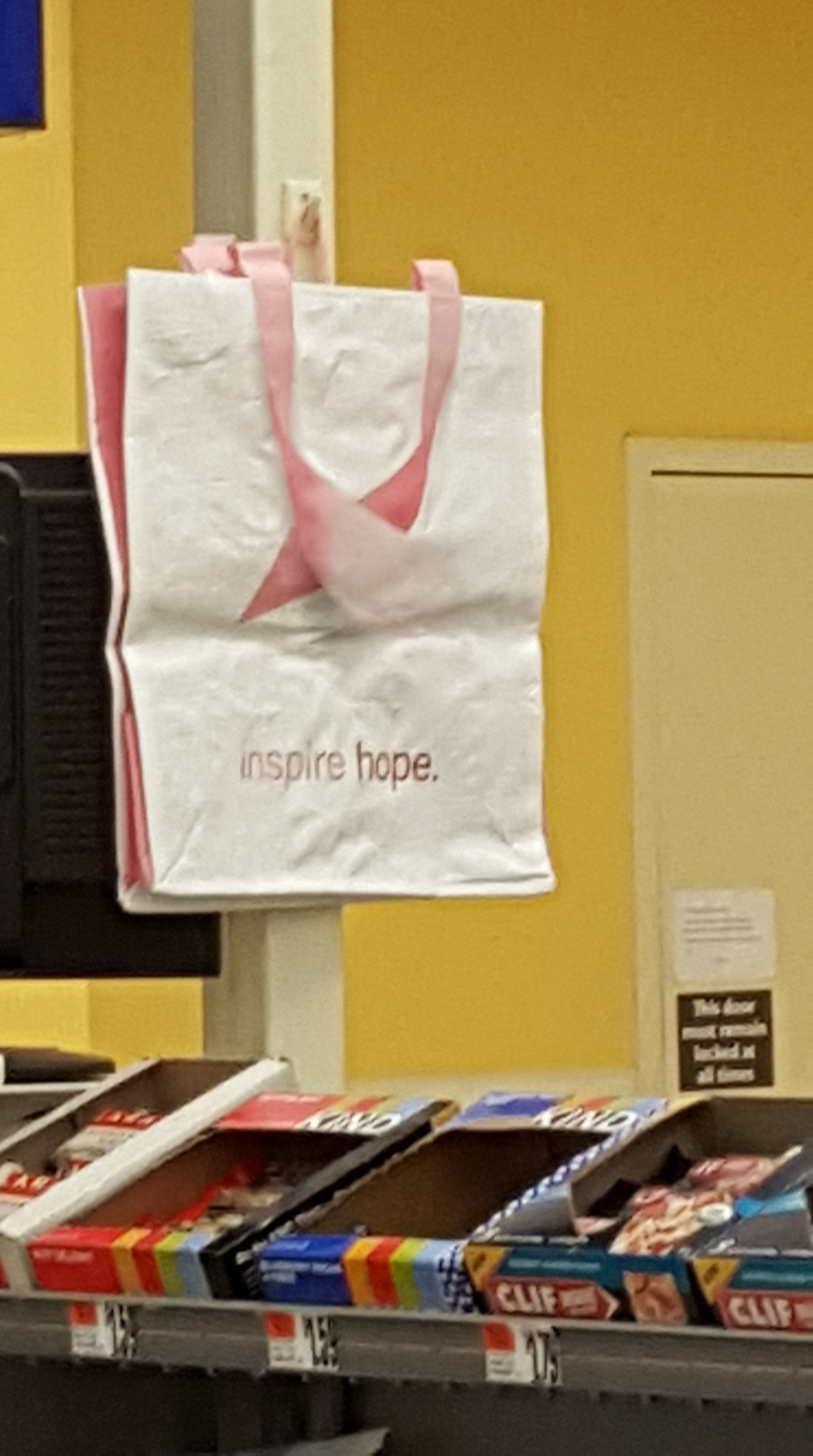 Before I got online this morning and saw all the posts about submitting 3 words to GMA for some Pink crap they are doing, I was already thinking about how the words and phrases about to fill all media are so damn meaningless (just like I thought this last year: Some Word Problems). I saw silly grocery bag (pictured below) with the ribbon and the words “inspire hope”, and all I could think was, “what does that even mean?” I snapped this picture while I was waiting in the checkout line, and naturally my gaze fell onto the People magazine with Jackie Collins on the cover—barf (I am sorry she died, but completely disagree with her views and am so jaded about ALL celebrity cancer stories that I just always want to barf when I hear of them).